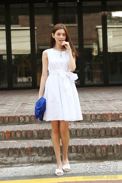 無袖款式的白色連衣裙,腰帶設計,大大的蝴蝶結系在一側,時尚又甜美,清純又減齡,讓你重新變回校園時代的女神。