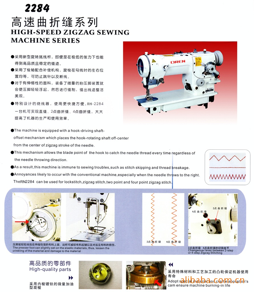 RN2280 / 2284高速曲折縫 本機采用新型旋轉(zhuǎn)挑線桿,即便是在極地的張力下也能得到高品質(zhì)且穩(wěn)定的線跡。采用了梭軸配合補償機構(gòu),旋梭在勾線時的左右位置均等,可防止跳線以及斷線。對與有伸縮性的布料,裝備了微量的抬壓腳裝置就會使壓腳輕輕浮起,然后進行縫紉,縫出的線跡整潔美觀。特別設計的繞線器,使用了更快捷方便,其中RN-2284N/2288N臺機可實現(xiàn)直縫、2點曲折縫、4點曲折縫及通過更換凸輪進行11種的花樣縫,大大提高了機器的生產(chǎn)和使用效率。